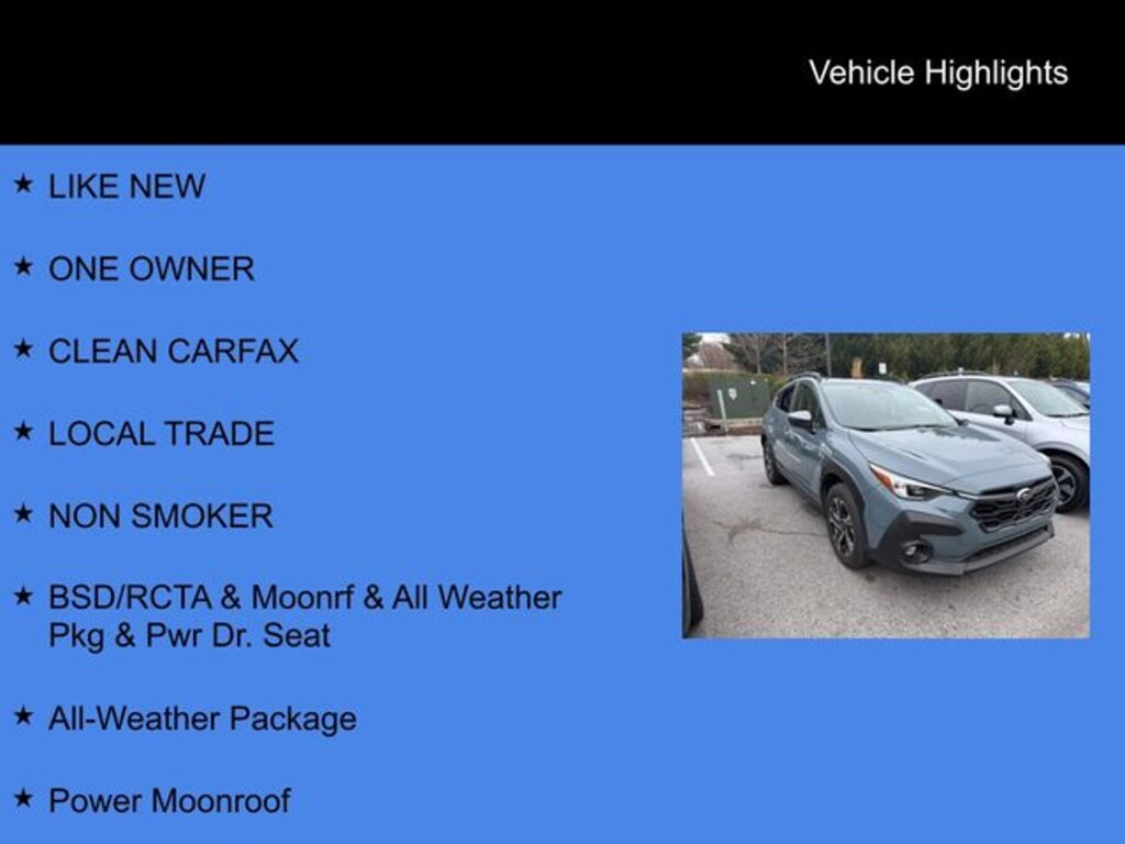 2024 Subaru Crosstrek Premium CARFAX One-Owner. Clean CARFAX. LIKE NEW, ONE OWNER, CLEAN CARFAX, LOCAL TRADE, NON SMOKER, 10-Way Power Driver's Seat, All-Weather Package, Blind Spot Detection w/Rear Cross-Traffic Alert, BSD/RCTA & Moonrf & All Weather Pkg & Pwr Dr. Seat, Heated Exterior Mirrors, Heated Front Seats, Heated Wipers, Power Moonroof. Odometer is 866 miles below market average! 27/34 City/Highway MPG